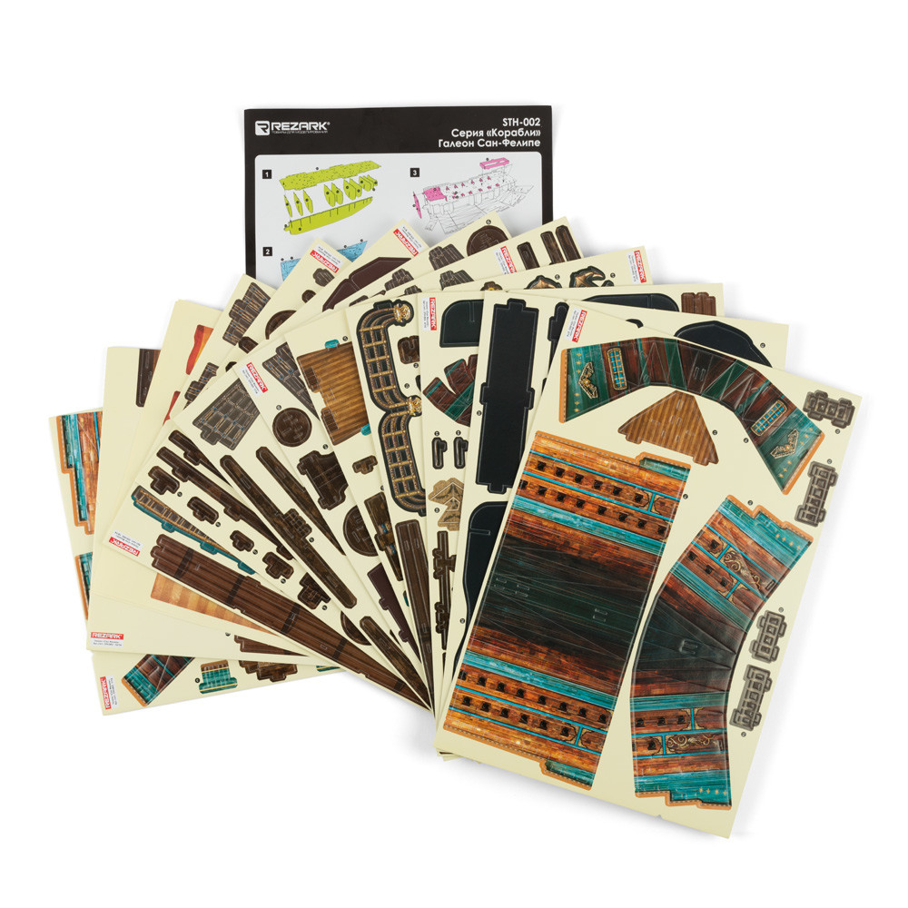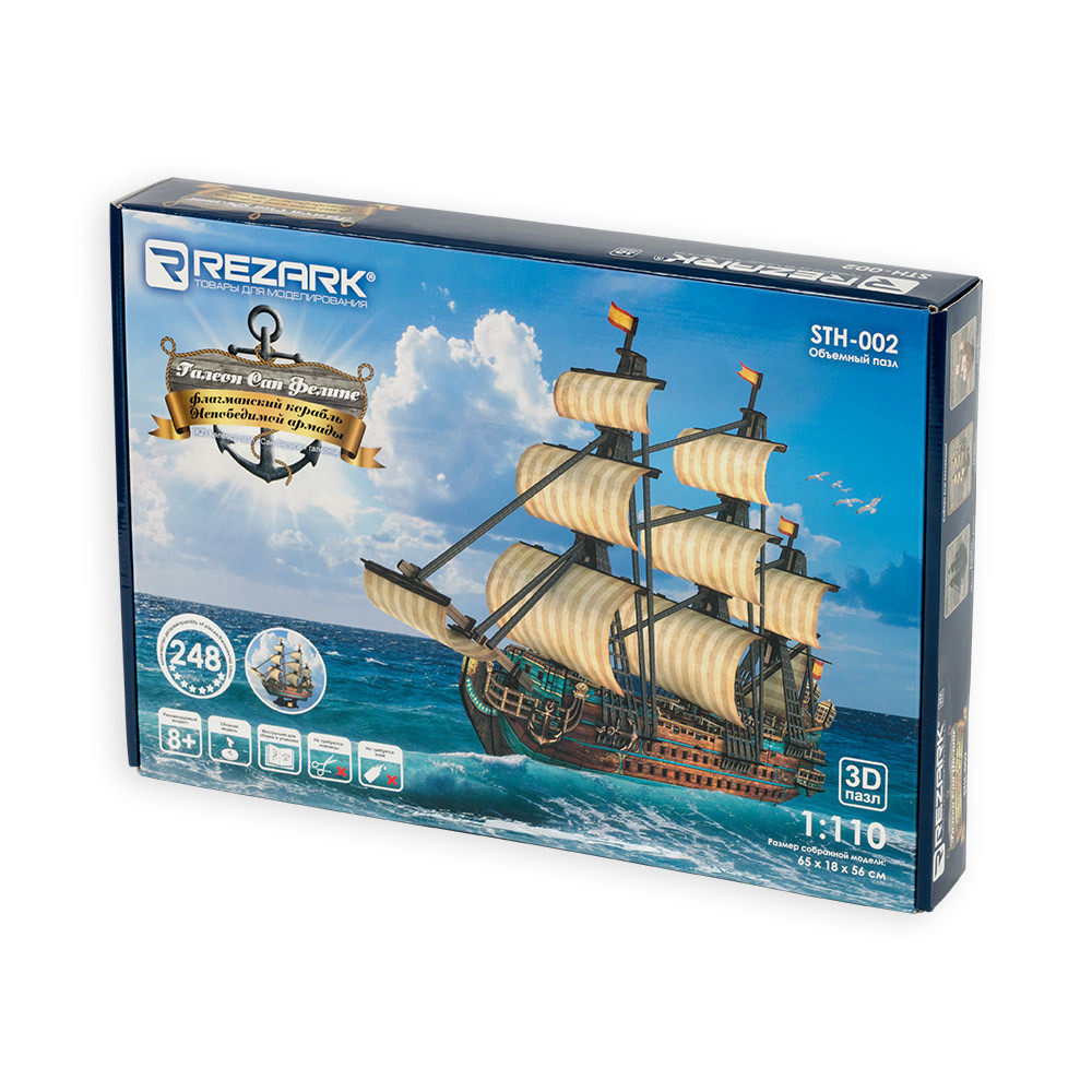 Галеон " Сан Фелипе" - флагманский корабль Непобедимой испанской армады. REZARK расширяет серию детских развивающих 3D- наборов для сборки. Величественный галеон Сан Фелипе окунет Вас и Вашего ребенка в мир морских сражений. Сборка корабля займет около 4- х часов. Рекомендуемый возраст 8+ Масштаб модели 1: 110Увлекательное занятие не только для детей, но и для взрослых! Для сборки модели не требуются ножницы и клей. Инструкция ( PDF) Сообщить о неточности в описании